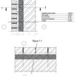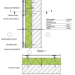 Sienos sujungimo su stogu, kai šilumos izoliacija dedama virš gegnių apšiltinimo detalė. Pjūvis 1-1