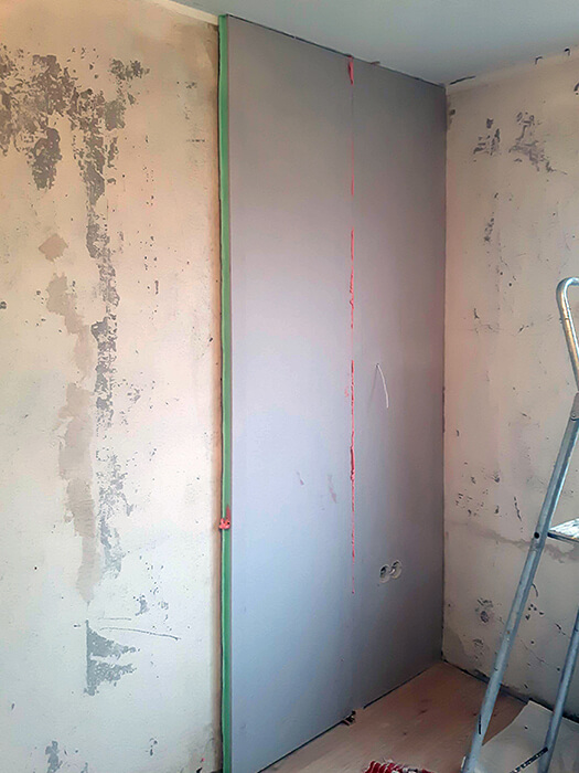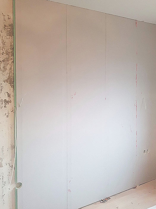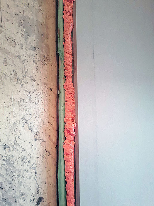 3. Tarpą tarp plokštės ir lubų bei plokštės ir grindų užsandarinkite poliuretano putomis.
