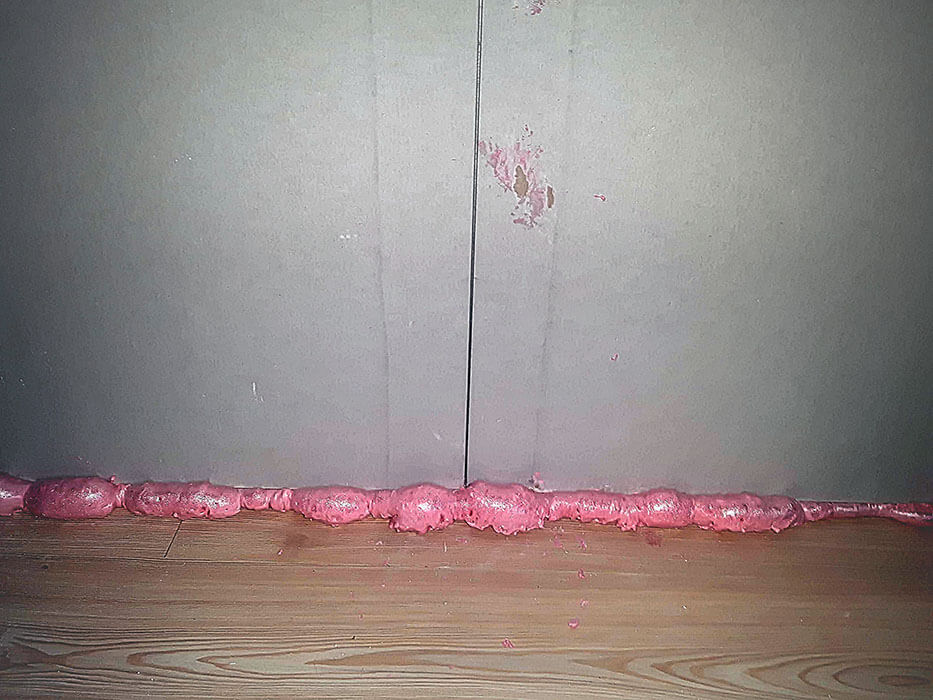2. Pradėkite nuo bet kurio kambario kampo – vingiuota linija užtepkite poliuretaninių klijų (klijuojančių putų) ant to paviršiaus, kuris dengtas aliuminio folija, prispauskite plokštę prie sienos kampe, apačioje palikdami apie pusantro centrimetro tarpelį (pasidarykite tokio dydžio kaištį, tuomet bus paprasčiau plokštę tiesiog ant jo uždėti, toks pat tarpelis liks ir viršuje).