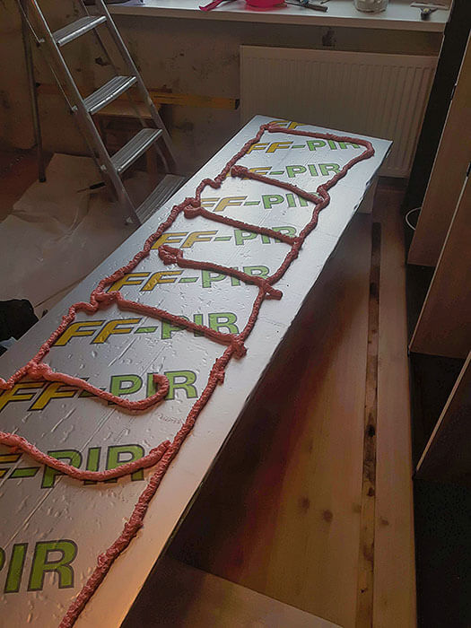 4. Kadangi kiekviena plokštė turi liežuvėlio ir griovelio jungtį, jos montuojamos užleidžiant vieną kraštą ant kito, toje vietoje taip pat užpurškiant poliuretaninių klijų.